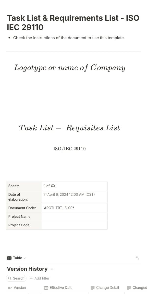 This Notion template aligns with ISO/IEC standards specifications, providing an automated template version control table. With this tool, you can easily add multiple collaborators to your workspace and keep an enhanced track of who makes changes. It allows for task addition and status updates and seamlessly integrates with requirements (acquisition of the software requirements template is required). Each element is aligned with the states specified by the standard, enabling efficient task prioritization. This template is prepared for the ISO/IEC 29110, but as indicated above, this template could be used in any other type of project at any standard.